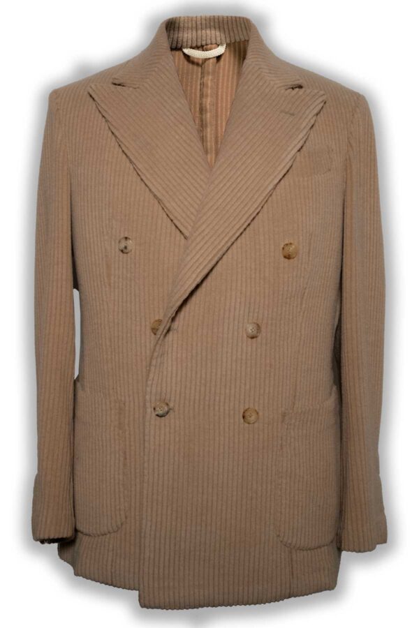 The Beige Cashmere Corduroy Double-Breasted Jacket reinterprets a menswear classic through the lens of Italian craftsmanship and luxury.