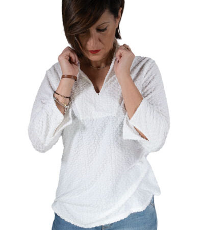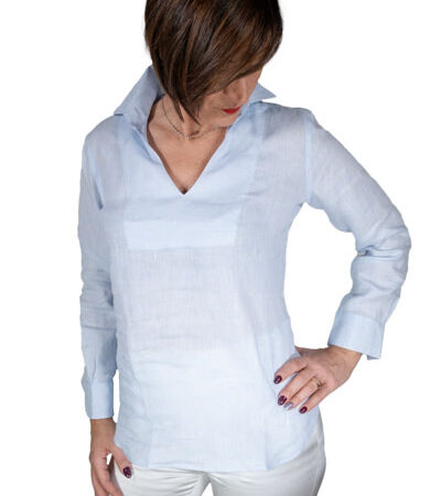We Made the woman shirt, entirely by hand from the cut to the finishing touches such as the stitching of the neck, the armhole to the hand-embroidered buttonholes, and hand-sewn buttons with “punto giglio”.