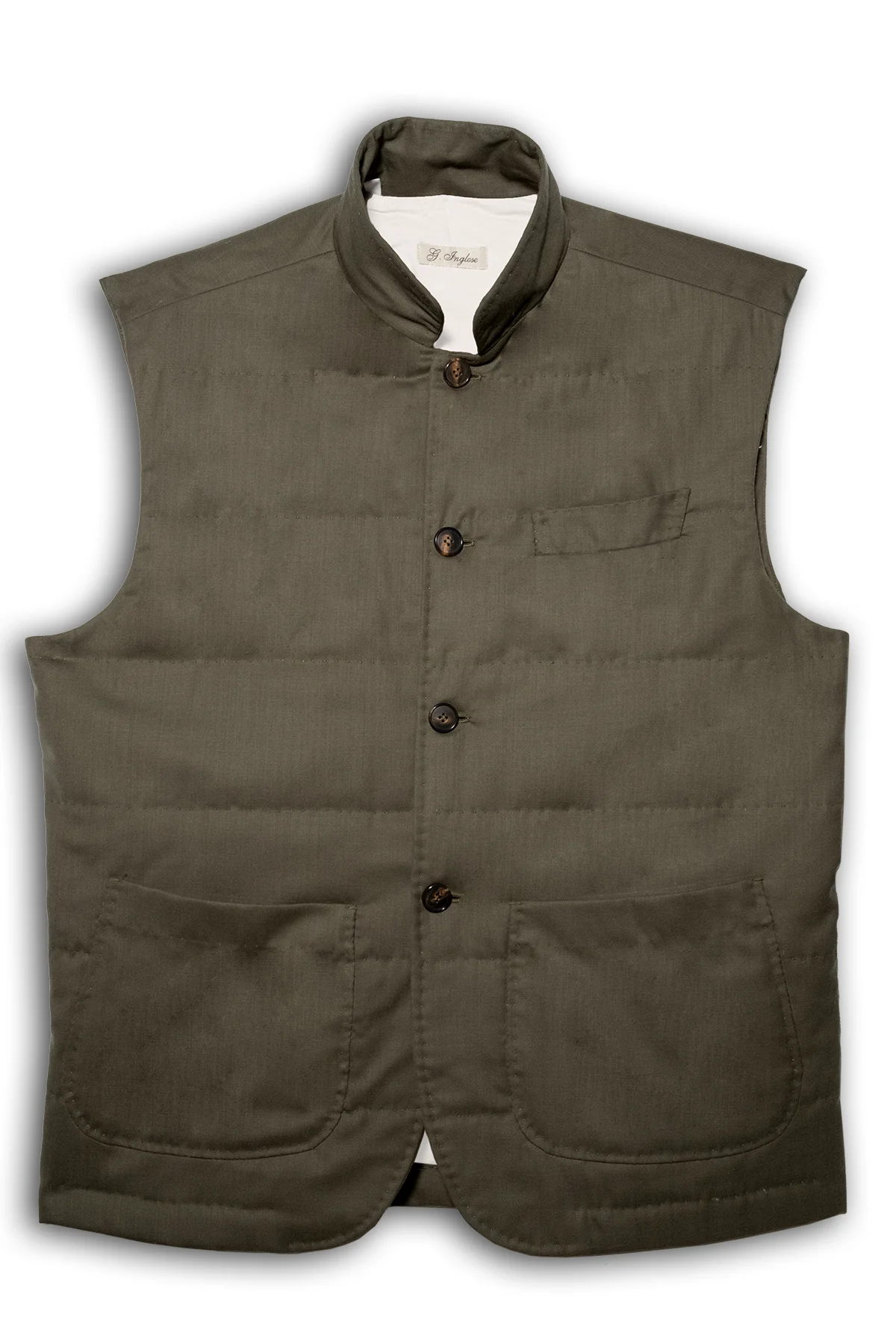 Refined green gilet in Tasmania wool with light padding and horn buttons. Ideal for mid-season layering.