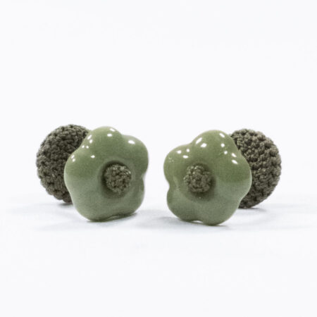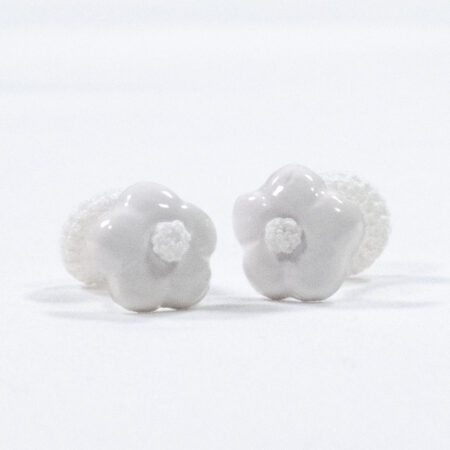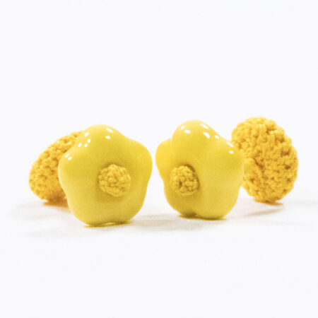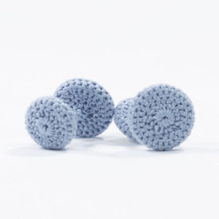 The cufflink, usually imagined as a double metal button for the cuffs, has been made contemporary, encapsulating a real mother-of-pearl button within spherical crochet textures.