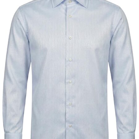The narrow blue stripe adds depth without drawing attention. It’s formal enough to wear with tailoring, but relaxed enough for everyday use. The proportions are balanced, and the collar is engineered to hold its shape consistently, whether you’re wearing it with a tie, under a jacket, or open at the neck.