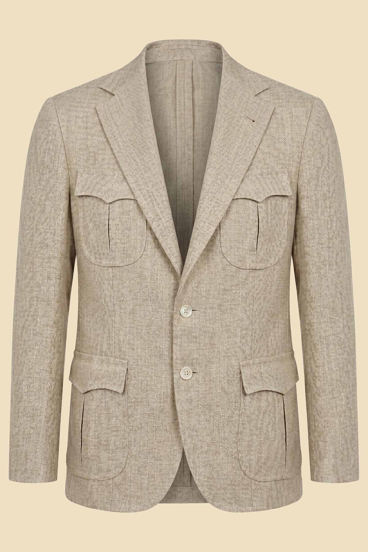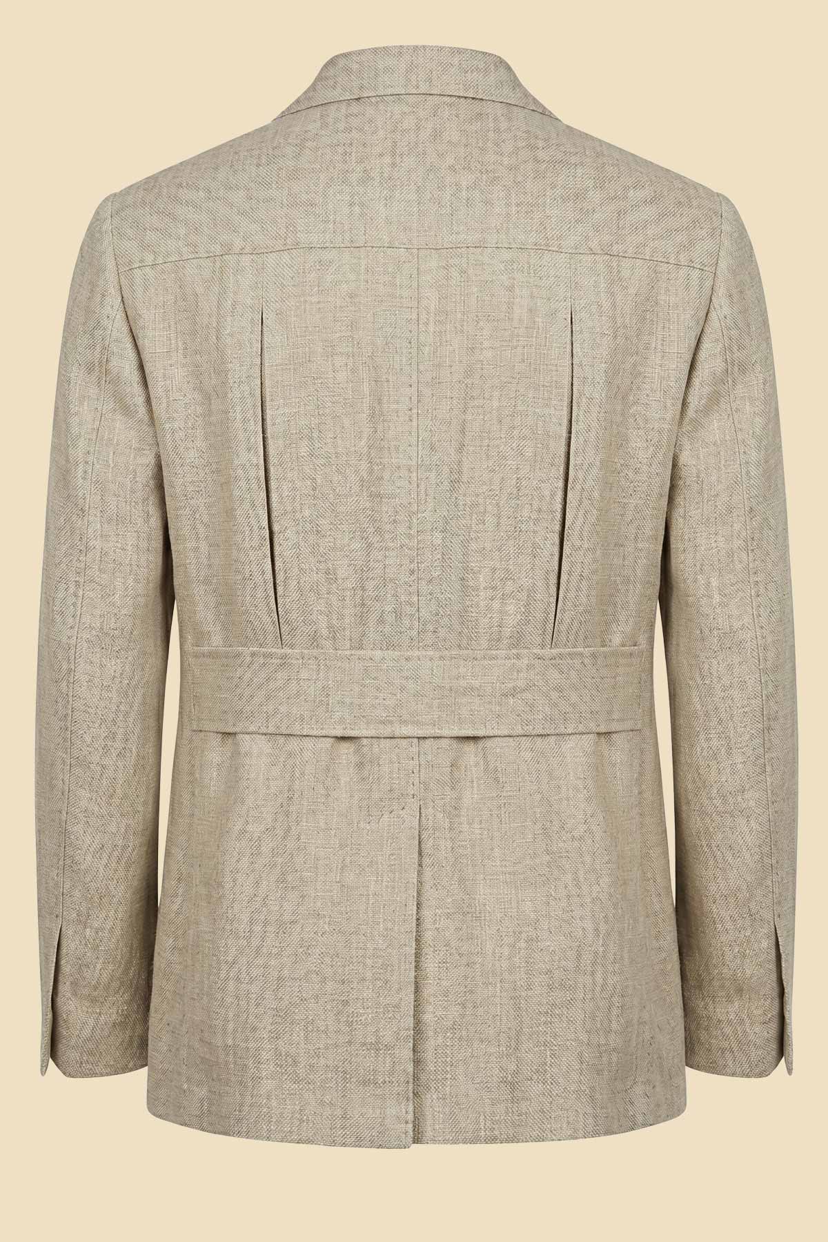 The military jacket, conceived as a refined hybrid between the sahariana and the tailored jacket, combines utility and elegance in a timeless silhouette. Defined by four bellows pockets with pointed flaps, a single-breasted lapel, and two rear pleats with a belt, it recalls a tradition of travel, function, and Italian sartorial distinction.